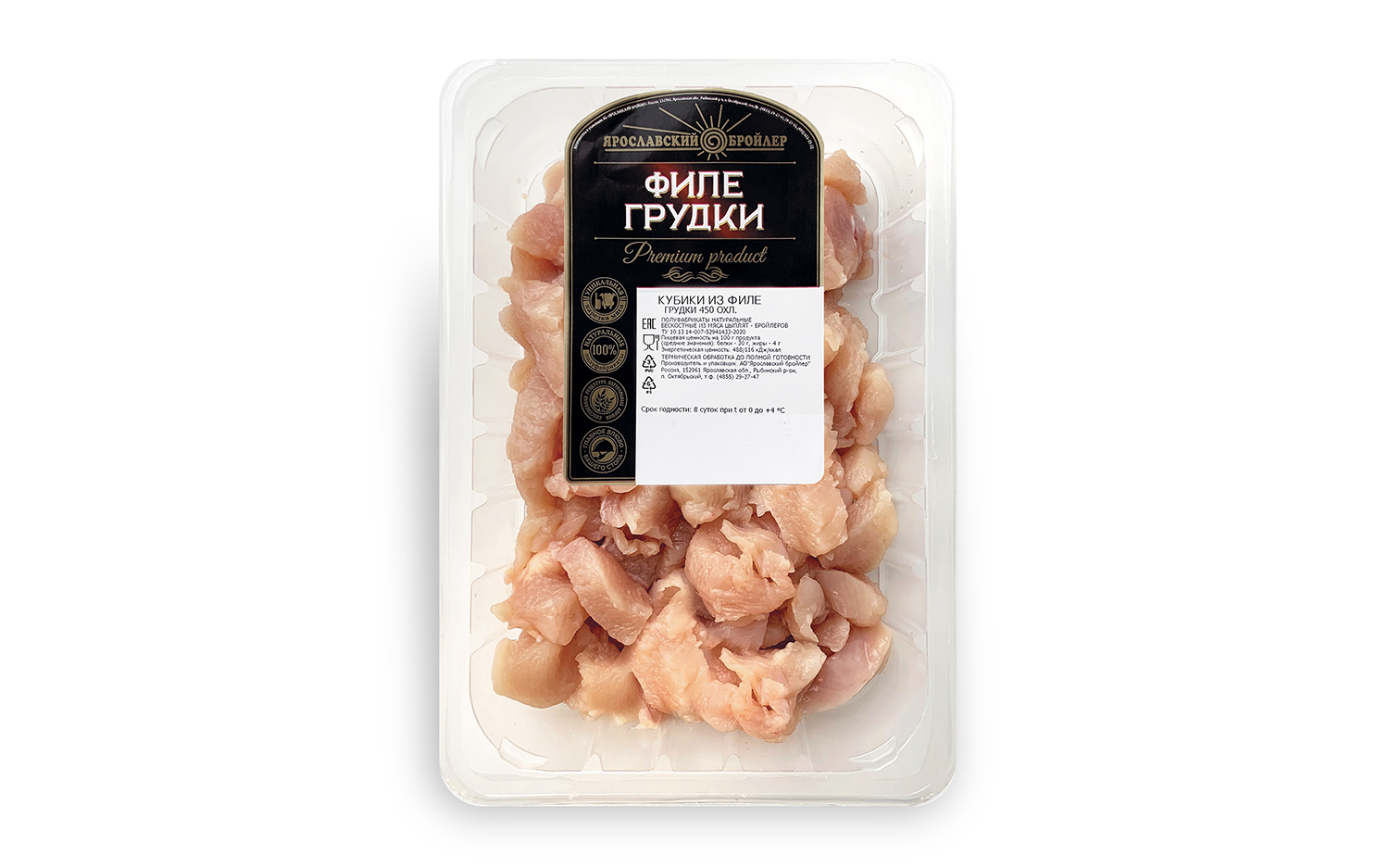 Универсальный продукт, который мы создали, заботясь о вашем удобстве и экономии времени. Прежде чем упаковать мясо в лоток, из филе грудки удаляют все жилки и пленки и нарезают небольшими кусочками. Вам остается лишь выбрать рецепт блюда. Одного лотка хватит для приготовления семейного ужина или нескольких приемов пищи для одного человека. Мясные кубики можно отваривать, жарить, запекать в духовке. Блюда из кубиков вкусны в любом виде, но особенно — если их приготовить в маринаде или соусе. Они отлично подойдут к любому гарниру, а также хороши в салатах.